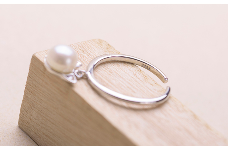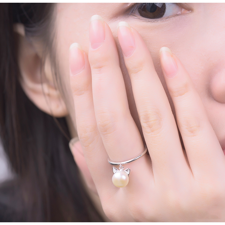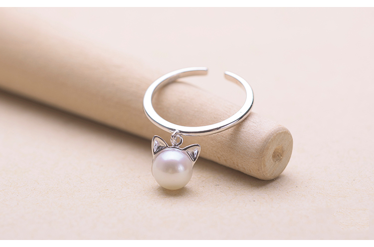 Anillo Ajustable Enchapado en Plata 925 – Perla con Diseño de Gatito