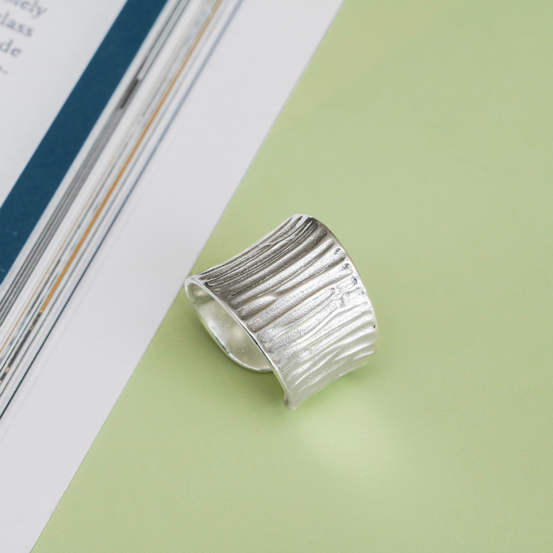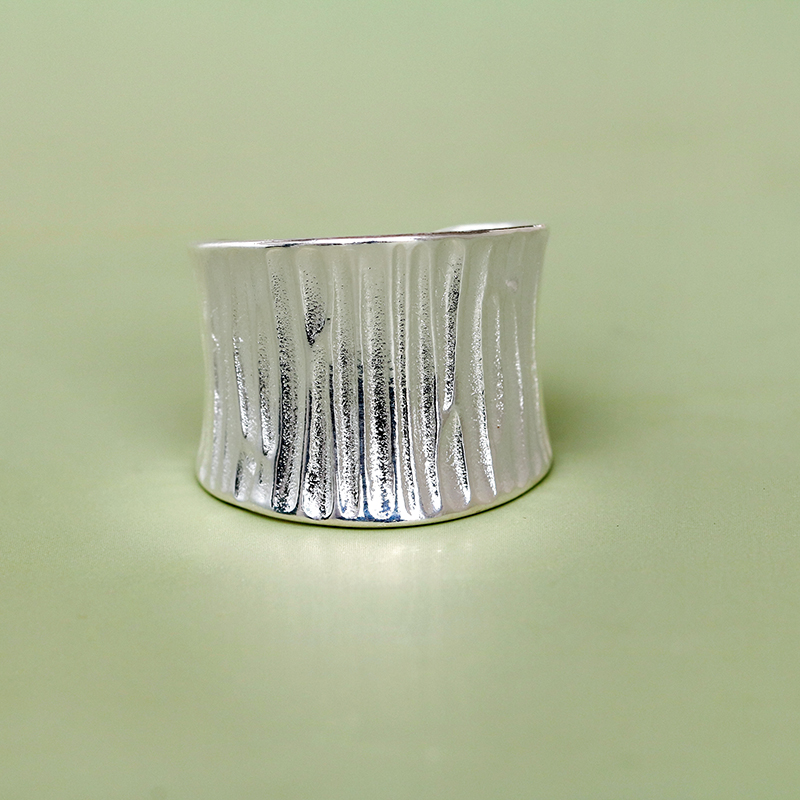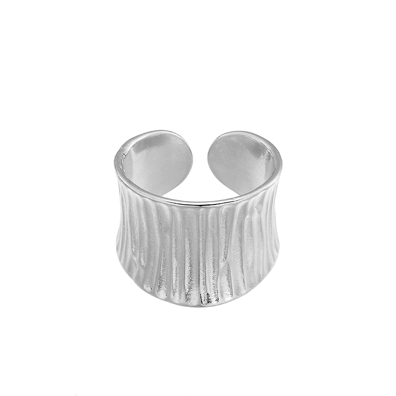 Anillo de estilo moderno con acabado enchapado en plata, ideal para complementar cualquier look con un toque elegante y minimalista. Su diseño presenta una textura vertical que le aporta personalidad y un acabado distintivo.