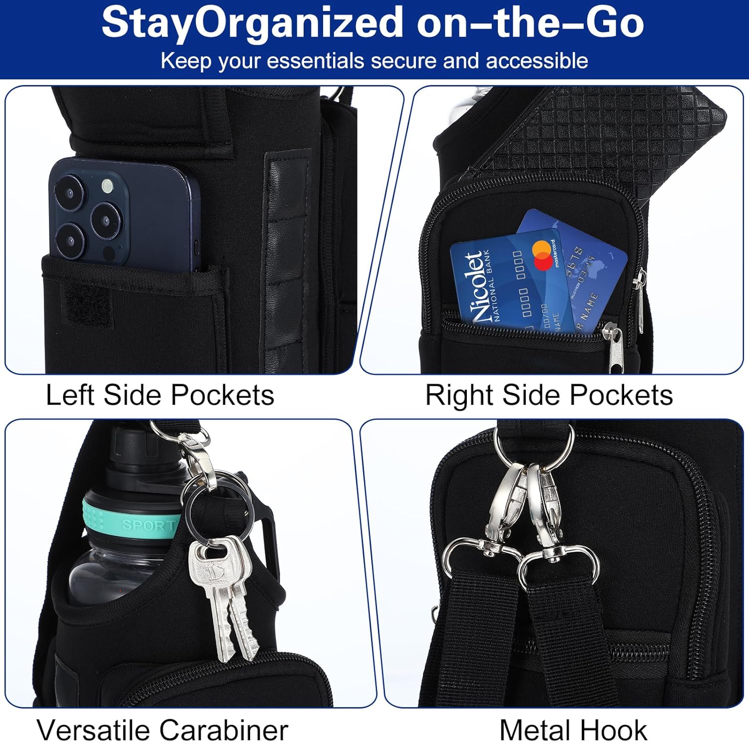 Diseño funcional: incluye un compartimento central para tu botella de agua y dos bolsillos laterales perfectos para guardar teléfono, llaves, auriculares o cartera.