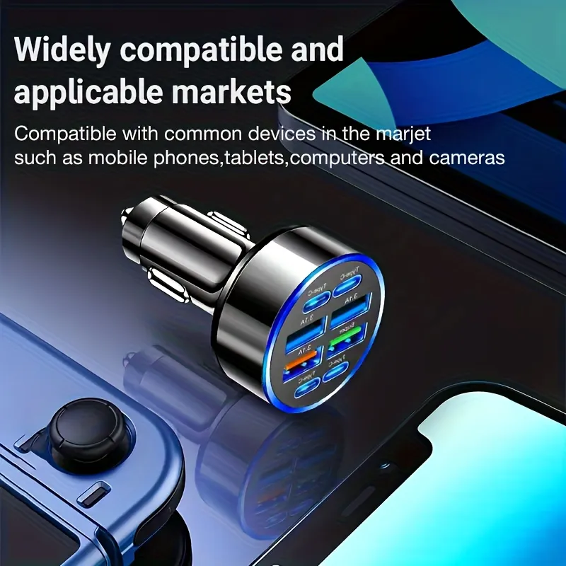 Cargador múltiple para vehículo diseñado para mantener todos tus dispositivos con batería mientras conducís. Gracias a sus 8 puertos (USB-C y USB-A), permite cargar varios equipos al mismo tiempo de forma rápida y estable.