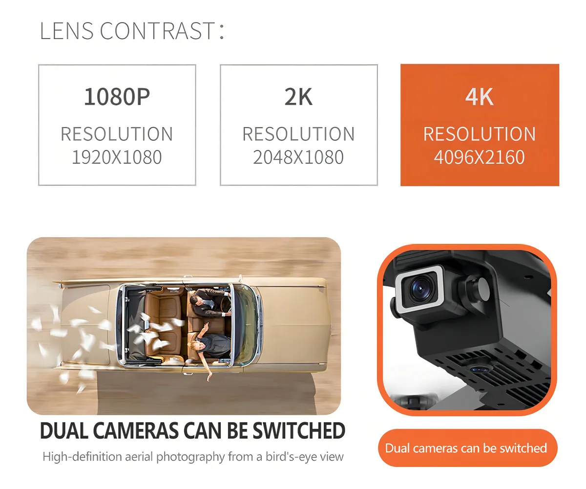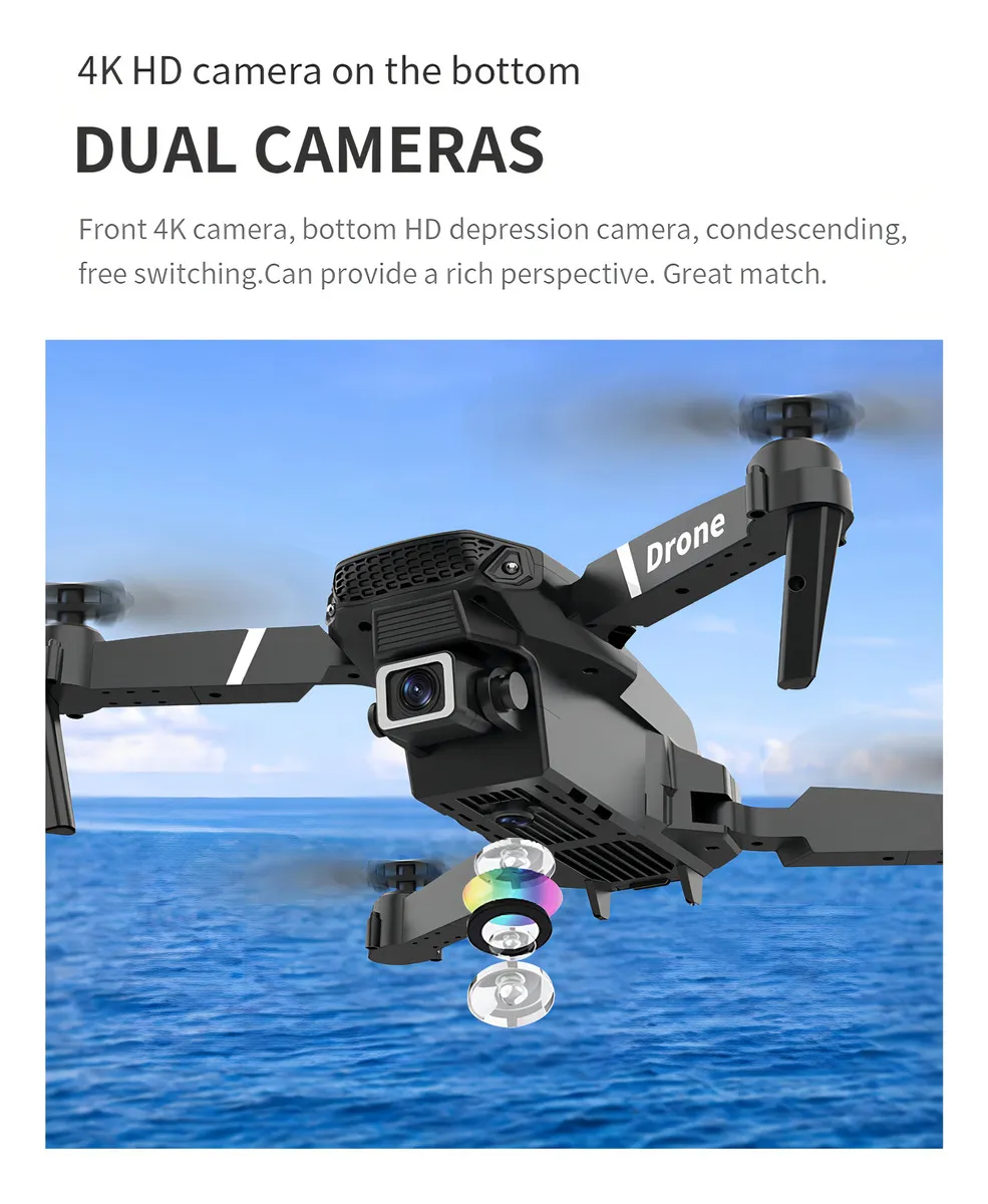 El E88 Pro Drone es un dispositivo de alto rendimiento diseñado para capturar imágenes aéreas nítidas y videos de gran calidad. Equipado con cámara dual 4K HD y transmisión WiFi en tiempo real, permite visualizar en tu teléfono inteligente todo lo que el dron graba, ofreciendo una perspectiva aérea única.