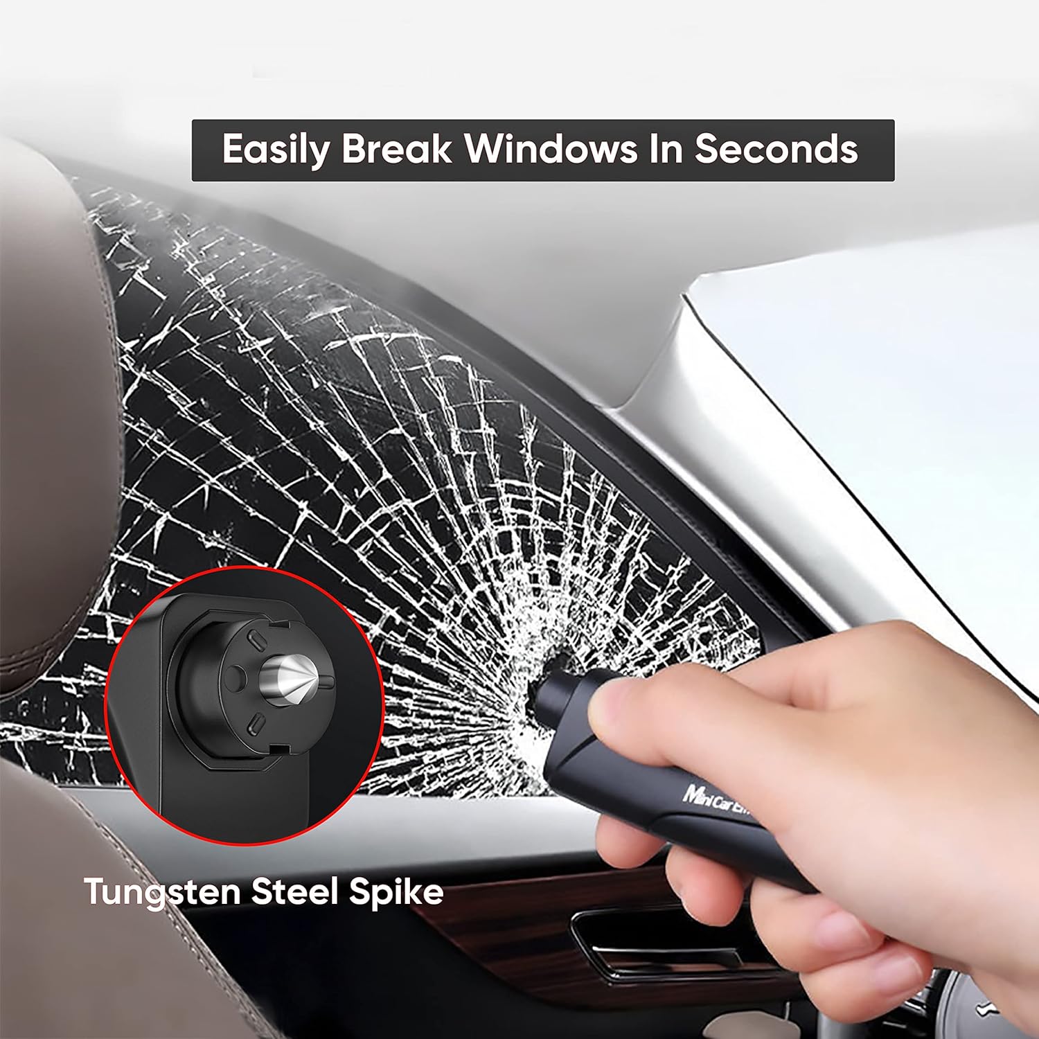 Dispositivo de seguridad diseñado para situaciones de emergencia dentro del vehículo. Combina un cortador de cinturón de seguridad y un rompe vidrios, permitiendo actuar rápidamente en caso de quedar atrapado.