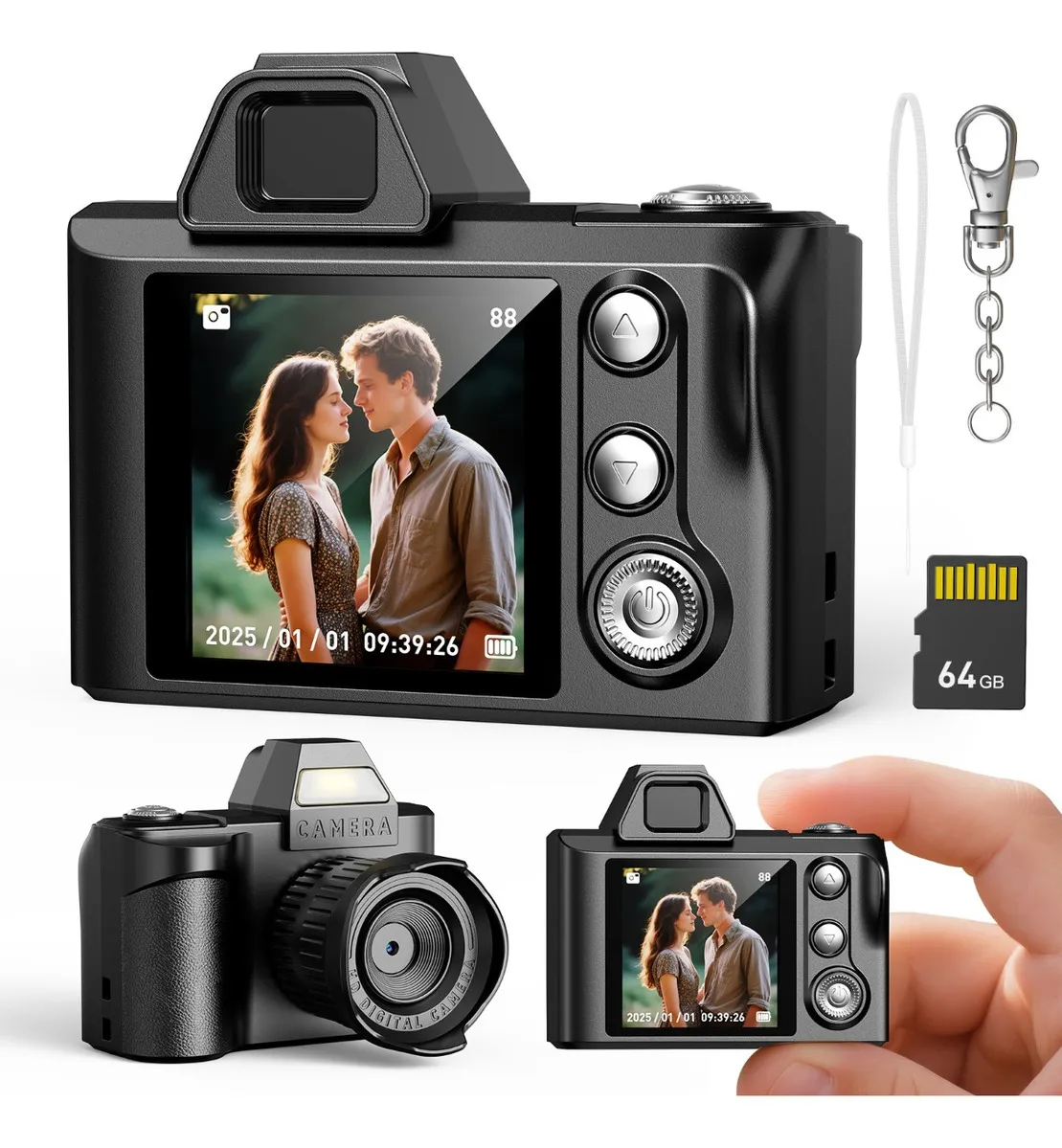 Cuenta con una pantalla de 2,5 pulgadas que facilita la visualización de imágenes y videos directamente desde el dispositivo. Además, funciona con batería recargable para mayor comodidad e incluye una tarjeta de memoria SD de 64 GB, lista para almacenar tus fotos y grabaciones desde el primer uso.